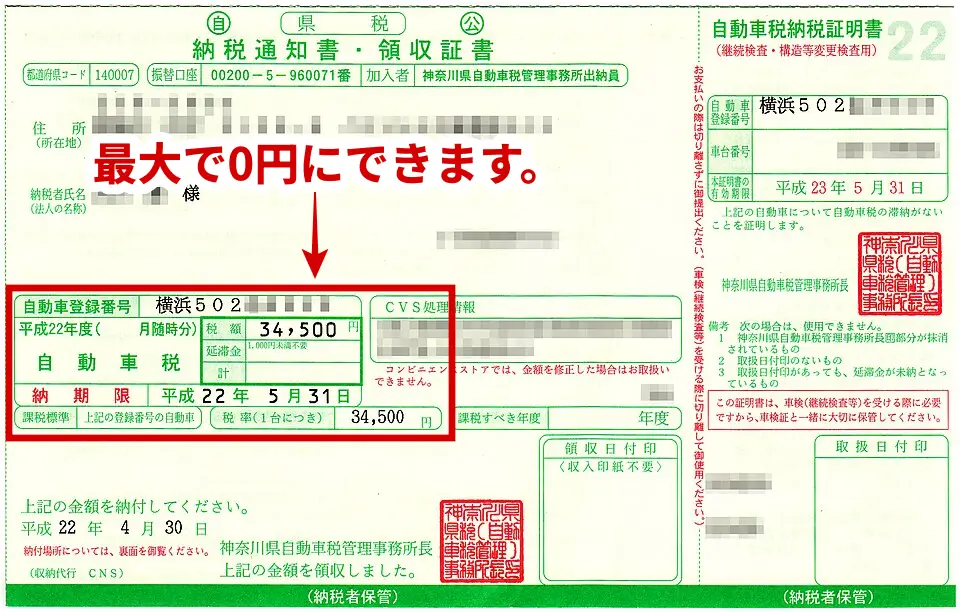 これから説明する方法を行うと、自動車税が最大で0円になります。